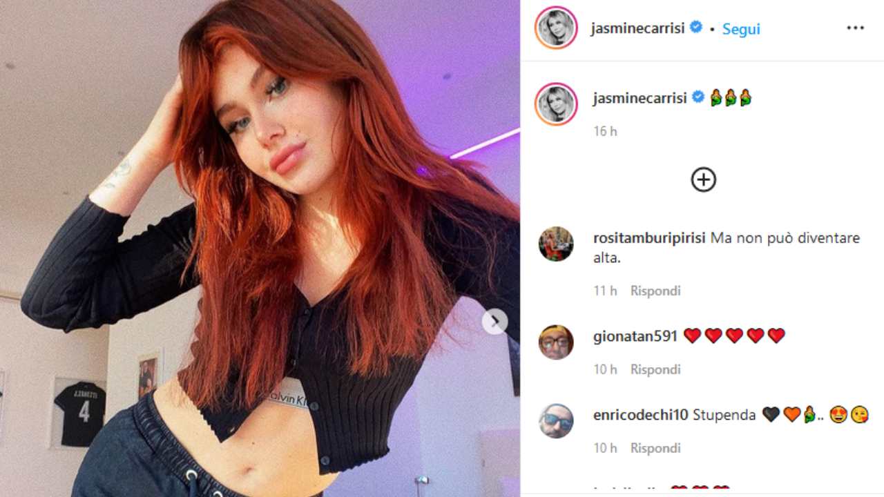 La piccola Carrisi quindi si è dedicata principalmente allo studio e al miglioramento delle proprie skill canore. Il suo rapporto con il pubblico e i media, invece, è continuato sui social. Ogni volta che Jasmine pubblica qualcosa fa discutere, come poche ore fa quando ha mostrato a tutti il cambio drastico di look. Nel post si mostra con i capelli di un rosso acceso, una scelta che ha preso di sorpresa e stupito tutti i suoi fan.