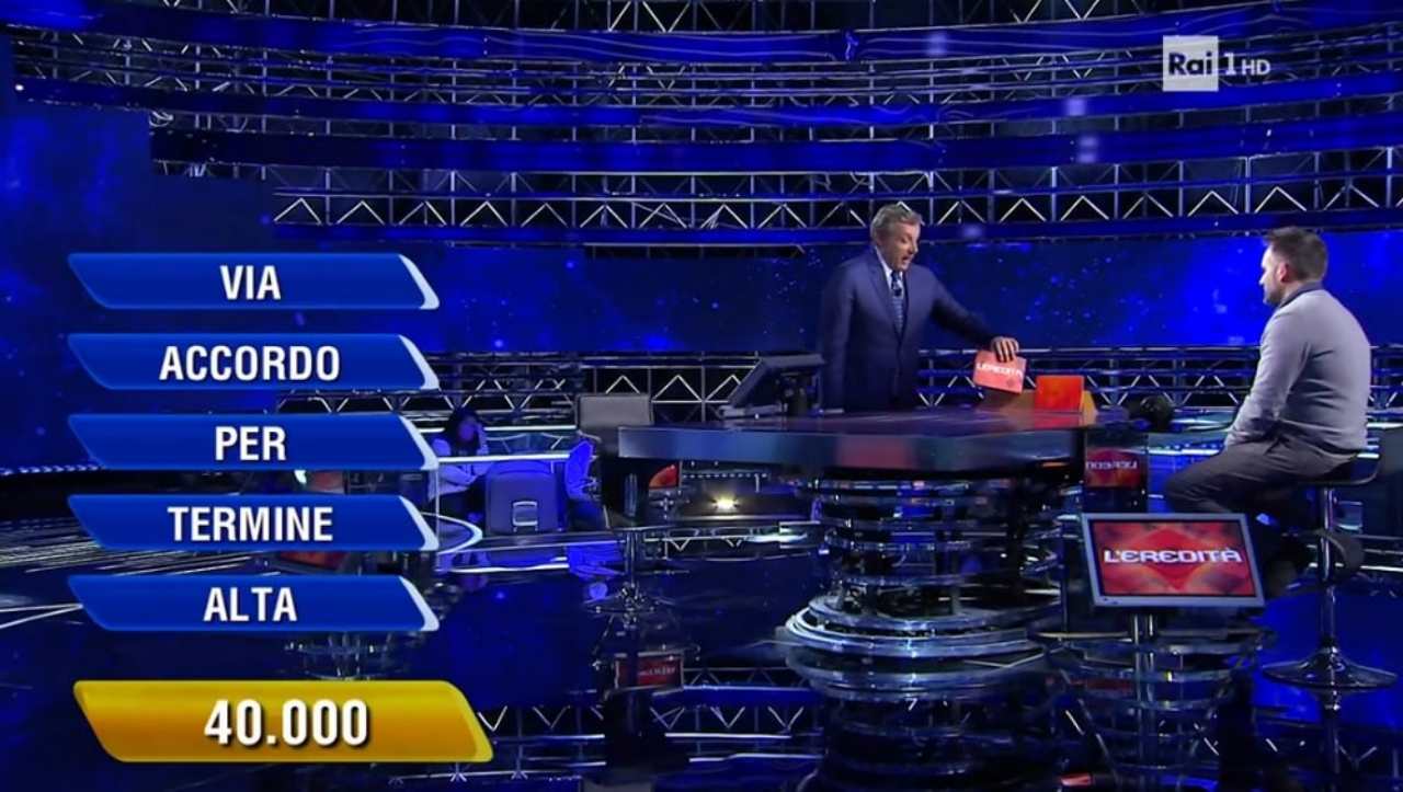 Quella di ieri è stata una puntata avvincente. Il precedente campione si è confrontato con uno sfidante veramente in gamba che ha piacevolmente sorpreso sia il pubblico a casa che il conduttore. Il percorso del ragazzo, Andrea, è stato perfetto fino alla Ghigliottina, il gioco finale che se superato permette di ottenere il montepremi finale. Il giovane concorrente è giunto all’appuntamento con 40mila euro, una cifra decisamente importante che farebbe comodo a chiunque.