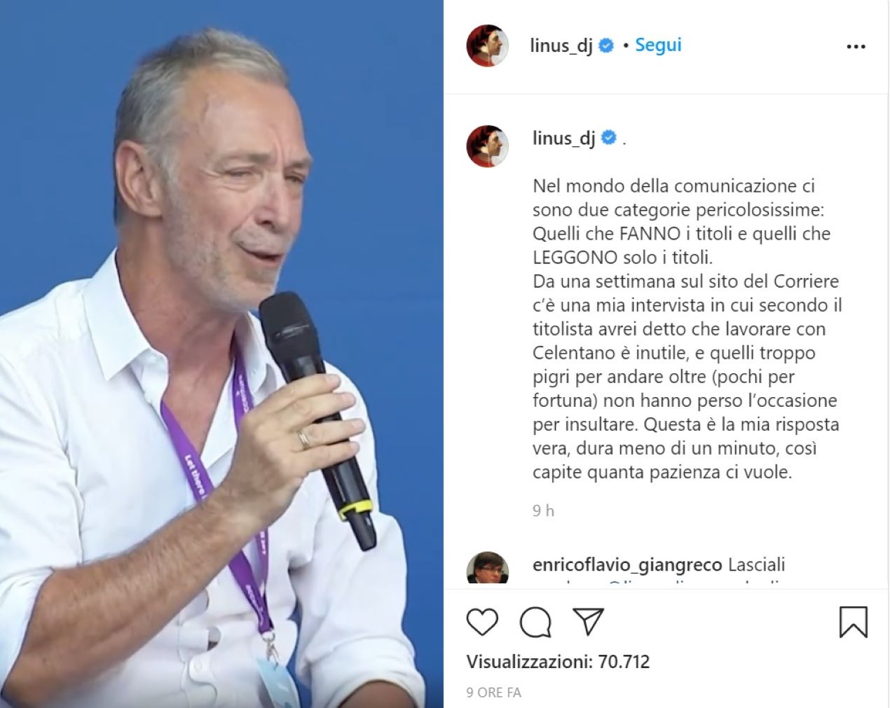 Partiamo dalla fine. Qualche ora fa Linus, stanco di insulti e critiche sui social, ha deciso di affidare a Instagram un definitivo chiarimento sulle sue parole, con tanto di video. “Nel mondo della comunicazione – scrive il famosissimo dj – ci sono due categorie pericolosissime: Quelli che FANNO i titoli e quelli che LEGGONO solo i titoli. Da una settimana sul sito del Corriere c’è una mia intervista in cui secondo il titolista avrei detto che lavorare con Celentano è inutile, e quelli troppo pigri per andare oltre (pochi per fortuna) non hanno perso l’occasione per insultare. Questa è la mia risposta vera, dura meno di un minuto, così capite quanta pazienza ci vuole”.