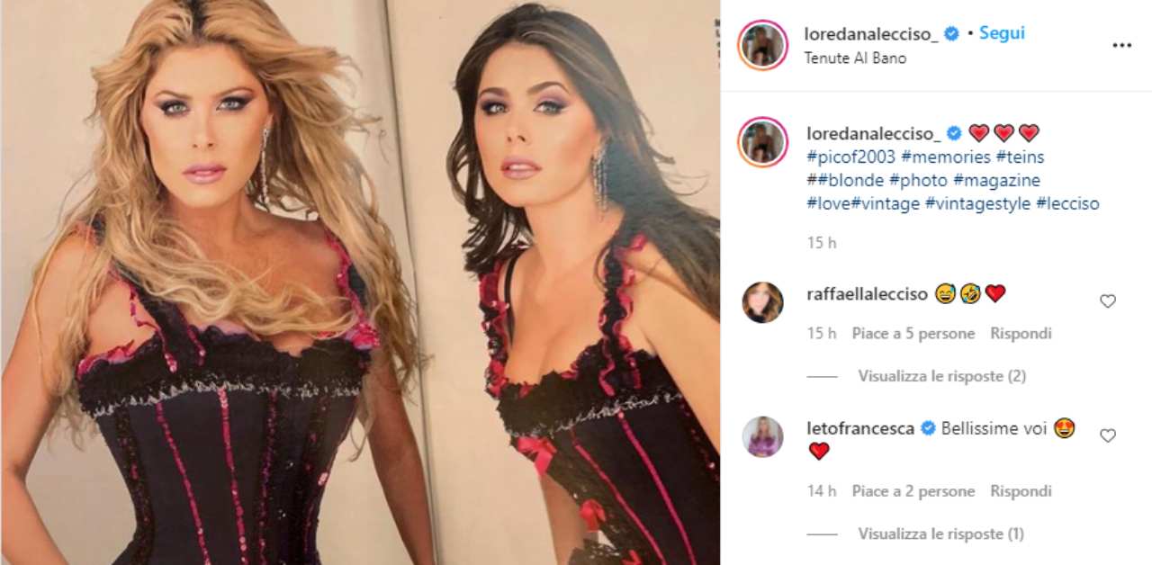 A distanza di qualche giorno dall’intervista concessa al settimanale, forse per nostalgia di quegli anni, forse solo per casualità, Loredana Lecciso ha pubblicato sul proprio profilo Instagram una foto risalente al 2003. Per l’occasione la si vede con indosso un body nero di pizzo, lo stesso che accanto a lei indossa la sorella Raffaella. Lo scatto è decisamente sensuale e ricorda a tutti quanto fosse provocante la sua bellezza.
