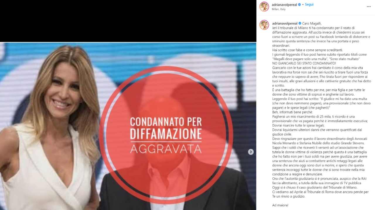 In seguito alla condanna per diffamazione ai danni di Giancarlo Magalli, la lite tra il conduttore e Adriana Volpe continua a distanza.