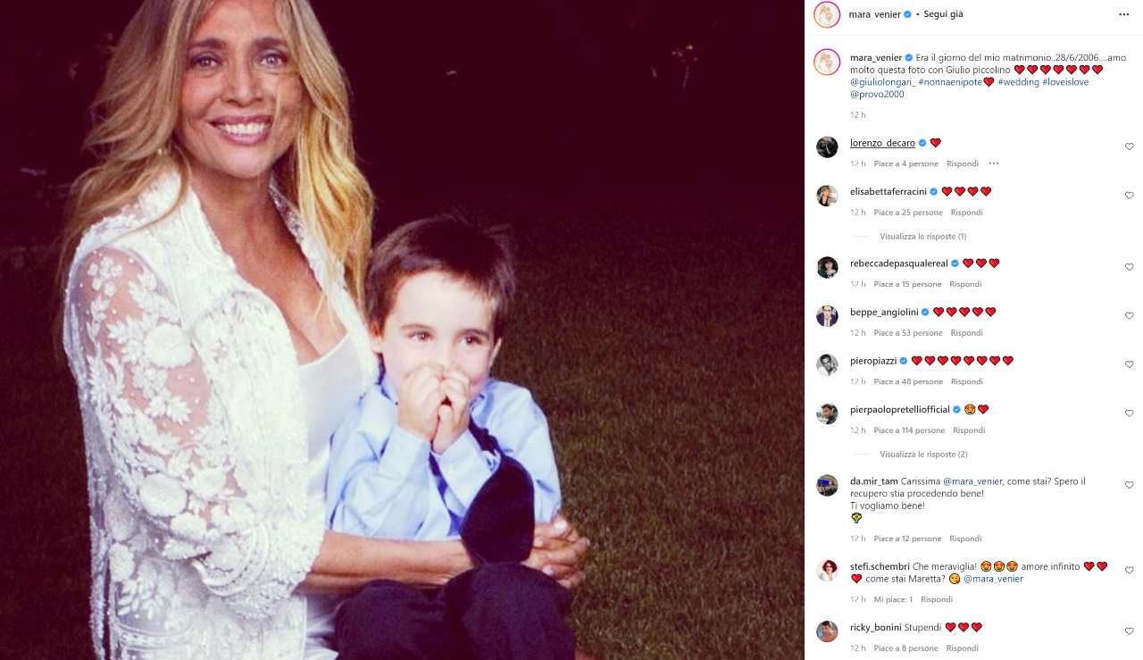 Ieri sera la conduttrice ha pubblicato un post di tutt’altro tenore: la si vede in abito bianco con il nipotino Giulio sulle ginocchia. Accanto alla foto scrive: “Era il giorno del mio matrimonio..28/6/2006….amo molto questa foto con Giulio piccolino”. Lo scatto ha fatto sciogliere il suo pubblico, contento di vederla in una foto così intima e dolce. Siamo abituati a vederla amorevole con il piccolo Claudio, ma Mara ha lo stesso tipo d’affetto anche con Giulio, solo che adesso è cresciuto e l’occasione per scattare foto di questo genere è sempre più rara.