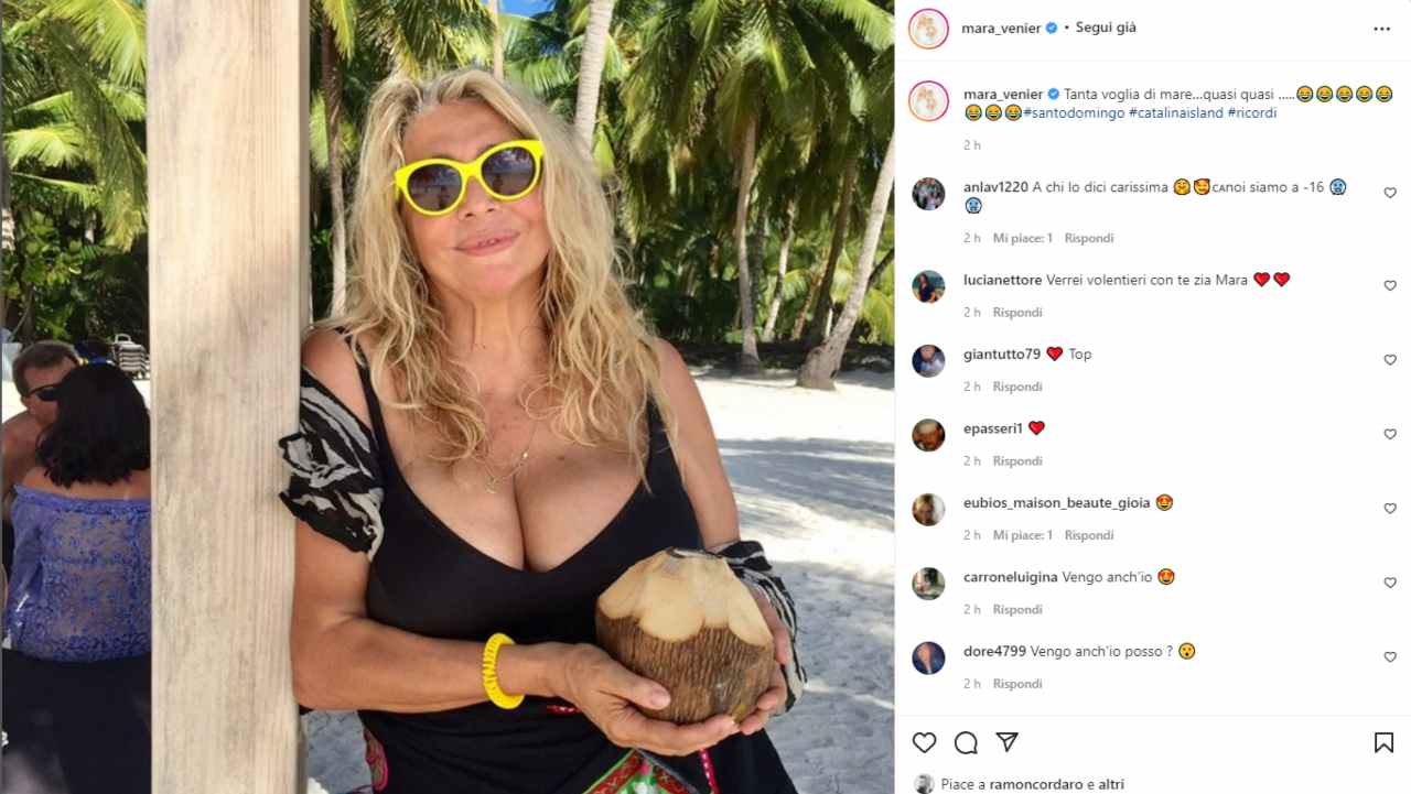 Tuttavia l’ultimo post pubblicato da Mara fa cominciare a temere i fan che la sua voglia di lasciare sia reale e che il prossimo anno si dovranno rassegnare ad una Domenica In condotta da qualcun altro. Nel post in questione la conduttrice ci mostra una foto in costume su una spiaggia assolata. In mano ha una noce di cocco ed è probabile sia stata scattata a Santo Domingo, località in cui lei e Nicola hanno una casa.