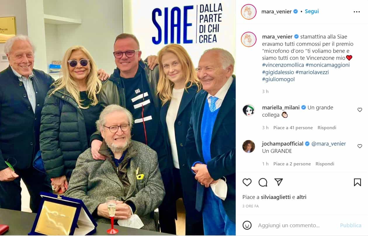 La stessa Mara Venier ha poi dedicato anche un post sul suo seguitissimo profilo Instagram a Vincenzo Mollica: “Stamattina alla Siae eravamo tutti commossi per il premio ‘microfono d’oro’ ti voliamo bene e siamo tutti con te Vincenzone mio❤️”. #vincenzomollica #monicamaggioni #gigidalessio #mariolavezzi #giuliomogol