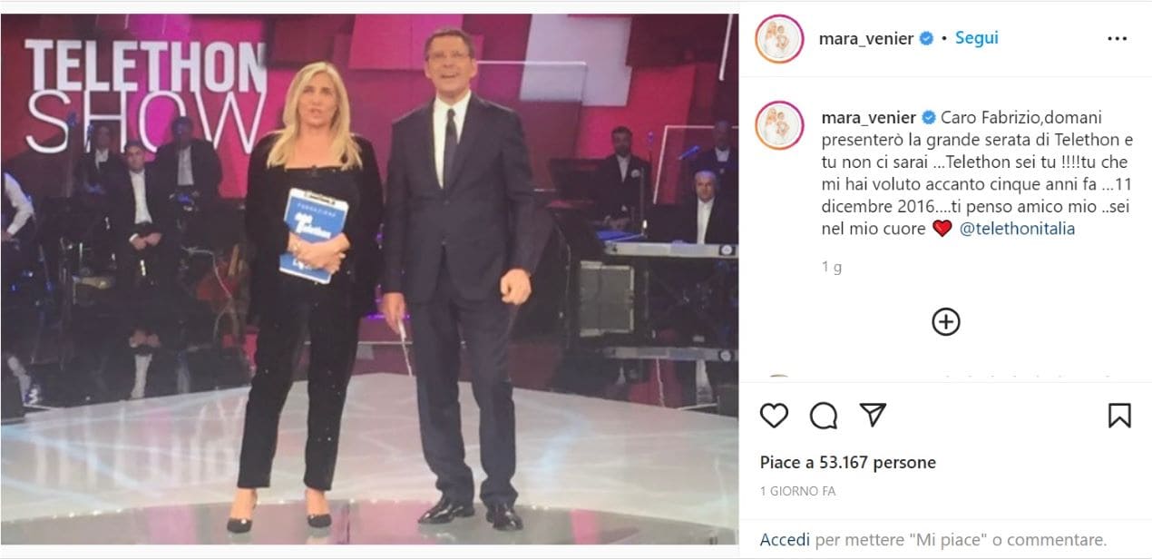 “Caro Fabrizio, domani presenterò la grande serata di Telethon e tu non ci sarai… Telethon sei tu!!!! tu che mi hai voluto accanto cinque anni fa… 11 dicembre 2016… ti penso amico mio ..sei nel mio cuore ❤️ @telethonitalia“. Queste le toccanti parole che Mara Venier ha affidato a un post sul suo seguitissimo profilo Instagram.