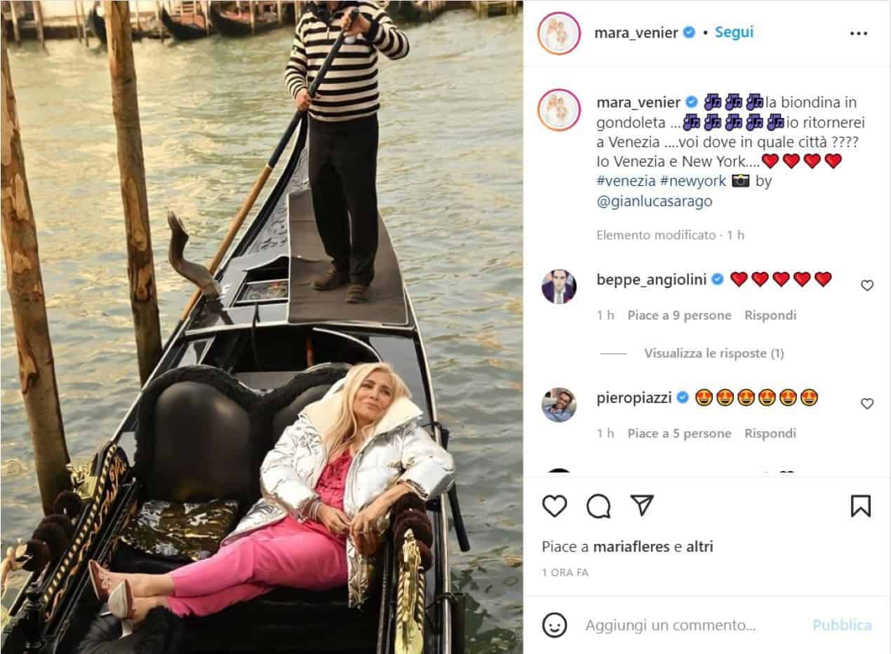 “🎶🎶🎶la biondina in gondoleta …🎶🎶🎶🎶🎶io ritornerei a Venezia ….voi dove in quale città ???? Io Venezia e New York….❤️❤️❤️❤️ #venezia #newyork 📸 by @gianlucasarago“: così si legge nell’ultimo post pubblicato da Mara Venier sul suo seguitissimo profilo Instagram. Con uno scatto in cui la Signora della Domenica italiana è letteralmente distesa a bordo di una gondola, con un look glamour, la forma fisica perfetta e lo sguardo perso in un mondo di sogni, dolci ricordi e soffici pensieri.