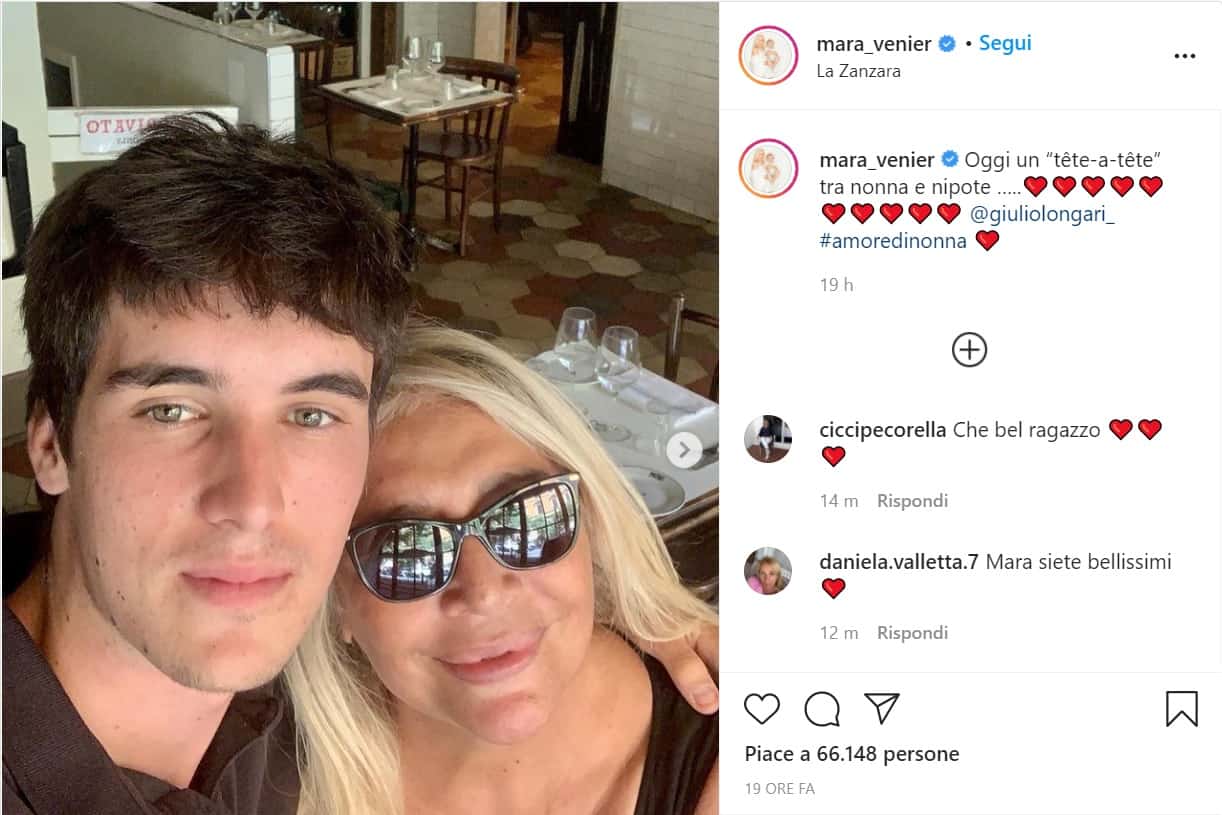 “Oggi un “tête-a-tête” tra nonna e nipote …..❤️❤️❤️❤️❤️❤️❤️❤️❤️❤️ @giuliolongari_ #amoredinonna ❤️”: così scrive Mara Venier nell’ultimo post sul suo seguitissimo profilo Instagram. La Nostra non nasconde la gioia per la compagnia speciale, in questi giorni che preludono al ritorno in televisione al timone di Domenica In, dopo le difficoltà dei mesi scorsi, con la lunga convalescenza post intervento ai denti andato male (tano da aver rischiato una paralisi facciale) e le complicazioni legate all’emergenza Covid-19.