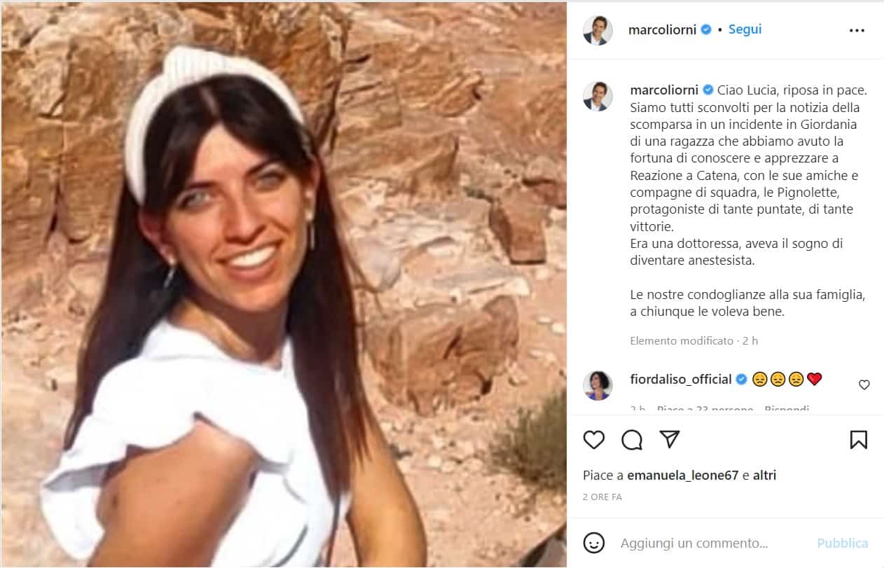 “Ciao Lucia, riposa in pace – scrive il conduttore -. Siamo tutti sconvolti per la notizia della scomparsa in un incidente in Giordania di una ragazza che abbiamo avuto la fortuna di conoscere e apprezzare a Reazione a Catena, con le sue amiche e compagne di squadra, le Pignolette, protagoniste di tante puntate, di tante vittorie. Era una dottoressa, aveva il sogno di diventare anestesista. Le nostre condoglianze alla sua famiglia, a chiunque le voleva bene”.