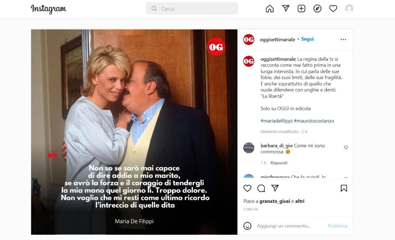 Ecco allora che a proposito del marito Maurizio Costanzo, che ha sempre dichiarato di volere la mano di lei stretta alla sua nell’ultimo istante, Maria De Filippi dice: “Le confesso che non so se ne sarò capace, se avrò la forza e il coraggio di tendergli la mia mano quel giorno lì. Troppo dolore. Non voglio che mi resti come ultimo ricordo l’intreccio di quelle dita”.