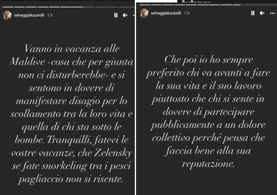 Selvaggia Lucarelli parte subito all’attacco: “Vanno in vacanza alle Maldive – cosa che per giunta non ci disturberebbe – e si sentono in dovere di manifestare disagio per lo scollamento tra la loro vita e quella di chi sta sotto le bombe. Tranquilli, fatevi le vostre vacanze che Zelensky, se fate snorkeling tra i pesci pagliaccio, non si risente”. E come se non bastasse l’opinionista aggiunge: “Che poi io ho sempre preferito chi va avanti a fare la sua vita e il suo lavoro, piuttosto che chi si sente in dovere di partecipare pubblicamente a un dolore collettivo perché pensa che faccia bene alla sua reputazione”.
