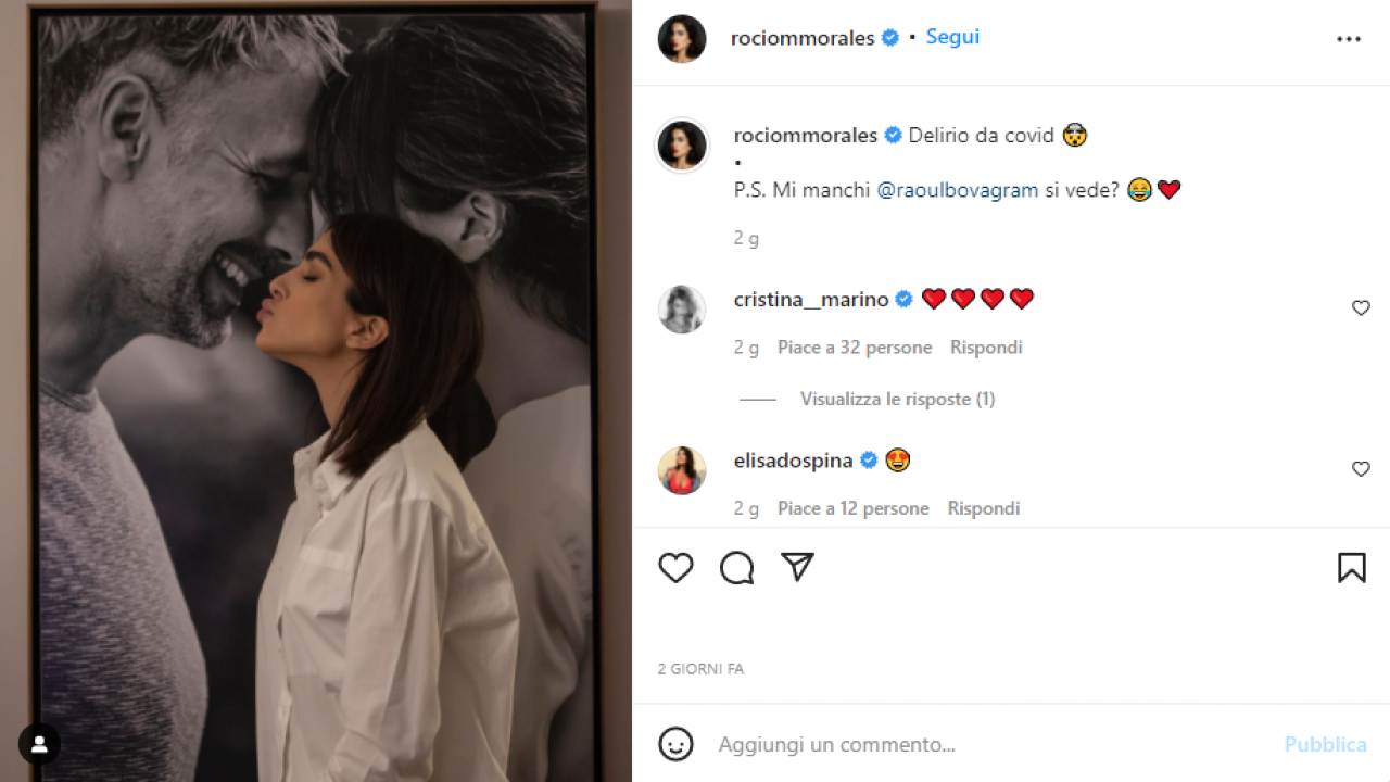 Il Covid colpisce tutti, in maniera totalmente indiscriminata. Lo sa bene l’attrice Rocio Muñoz Morales, moglie di Raoul Bova, la quale nei giorni scorsi è risultata positiva e ora vive in quarantena. Da sola, chiusa, senza la possibilità di abbracciare o aver alcun tipo di contatto fisico con le persone che più ama e che di solito le riempiono le giornate. Questa è la vita che sta trascorrendo in questi giorni l’attrice spagnola trentatreenne. La solitudine porta a pensare e a cercare di dimostrare il proprio affetto per le persone care in modo “telematico”, l’unico che rimane al momento. Lo abbiamo visto prima con la figlia, Luna, di cui ha pubblicato su Instagram una bellissima foto. Ora è toccato al marito, Raoul: l’attrice ha pubblicato una foto di sé mentre dà un bacio ad una gigantografia dell’attore con scritto “Delirio da covid. P.S. Mi manchi Raoul Bova, si vede?“. La risposta di lui non si è certo fatta attendere.