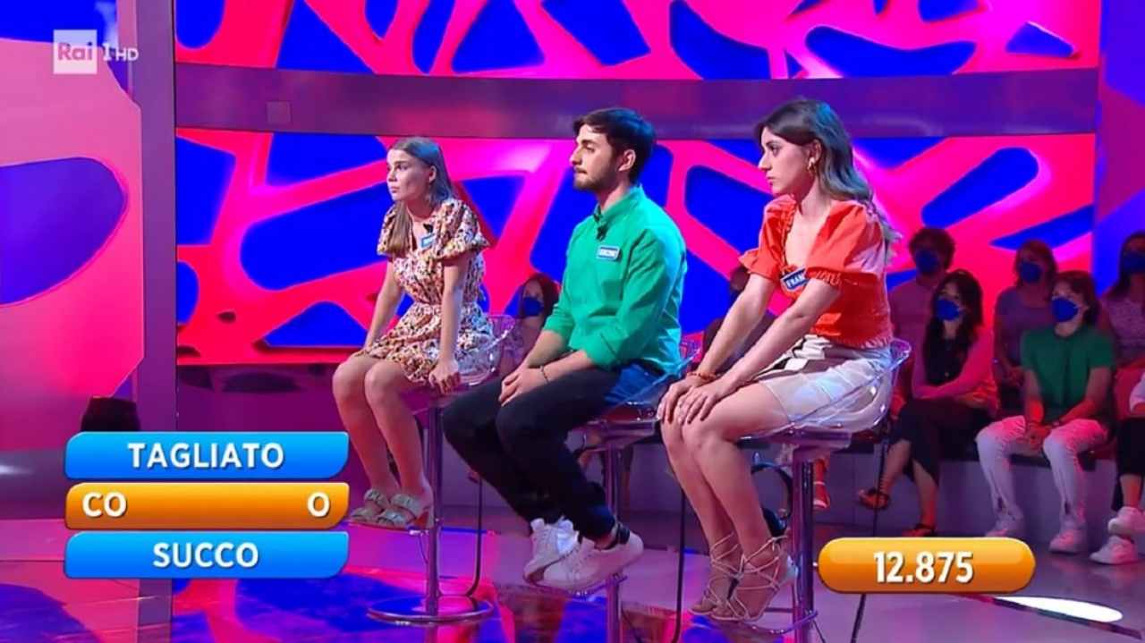 La situazione di partenza vedeva come primo elemento “Tagliato” e come parola segreta “Co____o”. I campioni hanno cercato di capire, discutendo tra loro, se c’era la possibilità di indovinare la parola senza il terzo elemento, ma hanno capito che non era possibile e dunque hanno deciso di dimezzare il montepremi da 26mila euro per ottenere il terzo elemento.