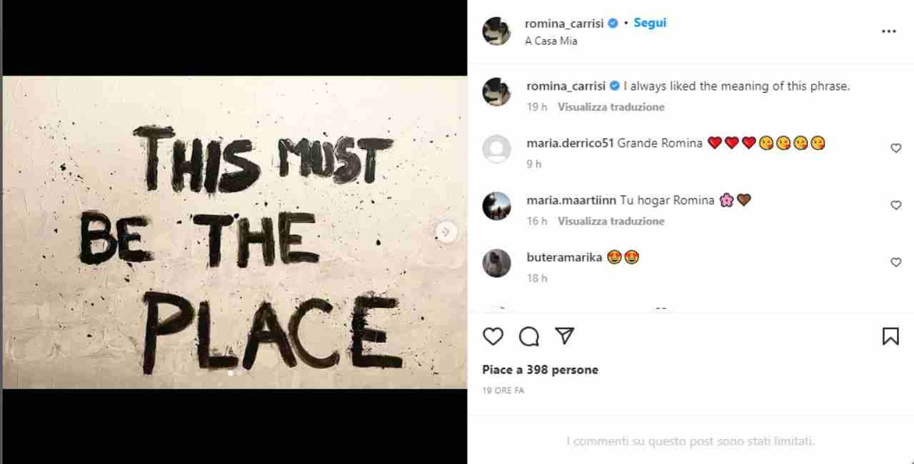 Il quadro consiste in uno sfondo bianco macchiato di schizzi neri con una frase al centro “This must be the place”, una frase che ha un significato profondo per Romina, come scrive nella descrizione del post. “Mi è sempre piaciuto il significato di questa frase”, scrive infatti in inglese nella caption da abbinare alla foto. Attraverso l’arte si possono davvero convogliare emozioni che nemmeno chi crea può comprendere a volte e non c’è cosa più bella di donarle anche agli altri, per sentire insieme.