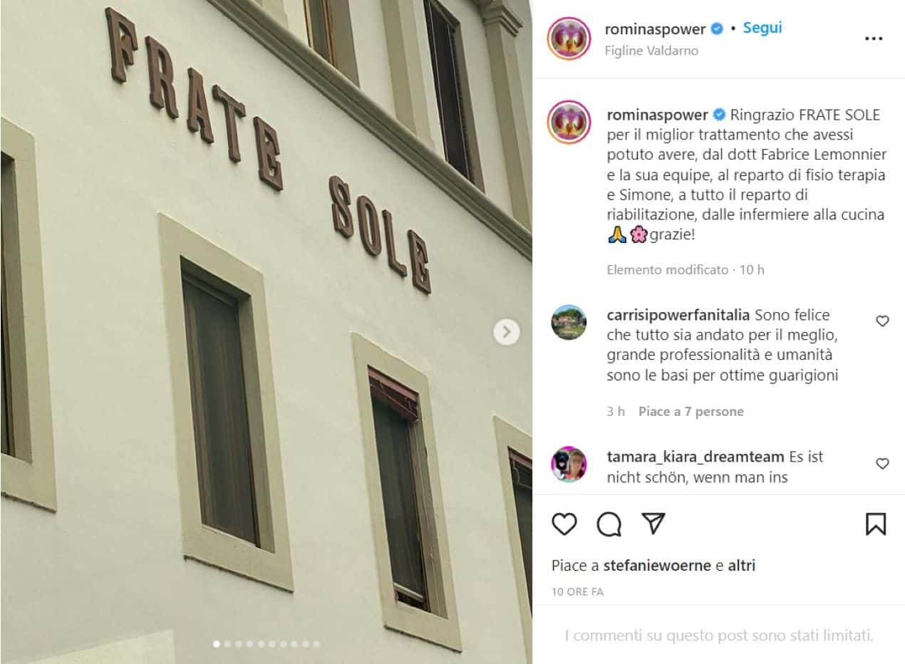 “Ringrazio FRATE SOLE per il miglior trattamento che avessi potuto avere, dal dott Fabrice Lemonnier e la sua equipe, al reparto di fisio terapia e Simone, a tutto il reparto di riabilitazione, dalle infermiere alla cucina 🙏🌸grazie!” si legge nell’ultimo post pubblicato da Romina Power sul suo seguitissimo profilo Instagram. La famosissima artista in questo periodo è stata infatti ospite all’interno della clinica Frate Sole di Figlino Valdarno, in Toscana, che si è presa cura di lei nel migliore dei modi. Proprio per questo Romina ha deciso di ringraziare tutti a dovere con un post su Instagram.