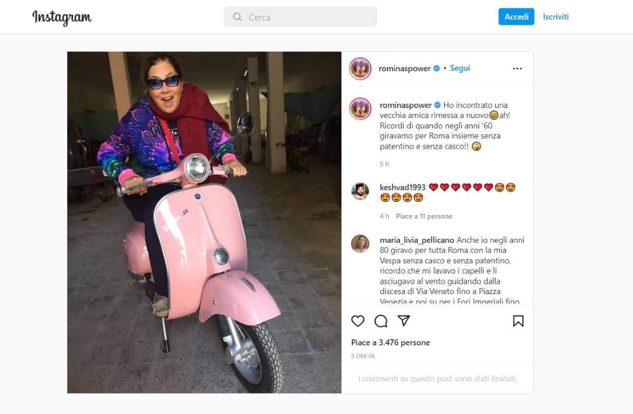 “Ho incontrato una vecchia amica rimessa a nuovo😁ah! Ricordi di quando negli anni ‘60 giravamo per Roma insieme senza patentino e senza casco!! 🤪”: così scrive Romina Power nel suo ultimo cliccatissimo post su Instagram. Il messaggio è accompagnato da una foto della cantante che sorride, scanzonata e frizzantina, ben lieta di potersi concedere questo tuffo nel passato.