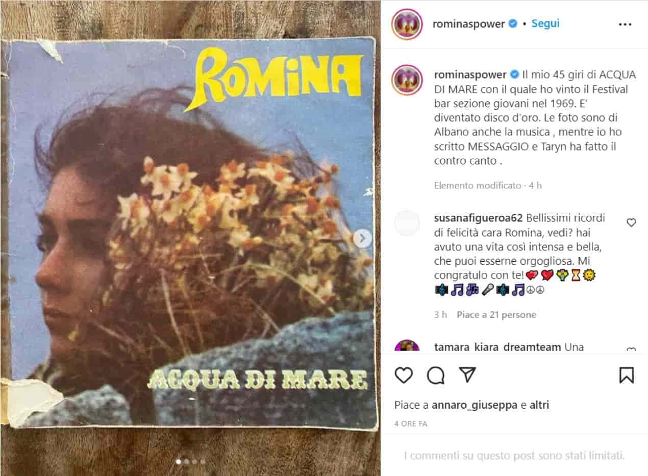 Al Bano è artefice e supporto vocale di “Acqua di mare”, una canzone morbida e tiepida affidata all’interpretazione diafana della diciottenne Romina. Un’emozione che lei non ha dimenticato, tanto da scriverne in un post appena pubblicato su Instagram: “Il mio 45 giri di ACQUA DI MARE con il quale ho vinto il Festival bar sezione giovani nel 1969. E’ diventato disco d’oro. Le foto sono di Albano anche la musica, mentre io ho scritto MESSAGGIO e Taryn ha fatto il contro canto”.