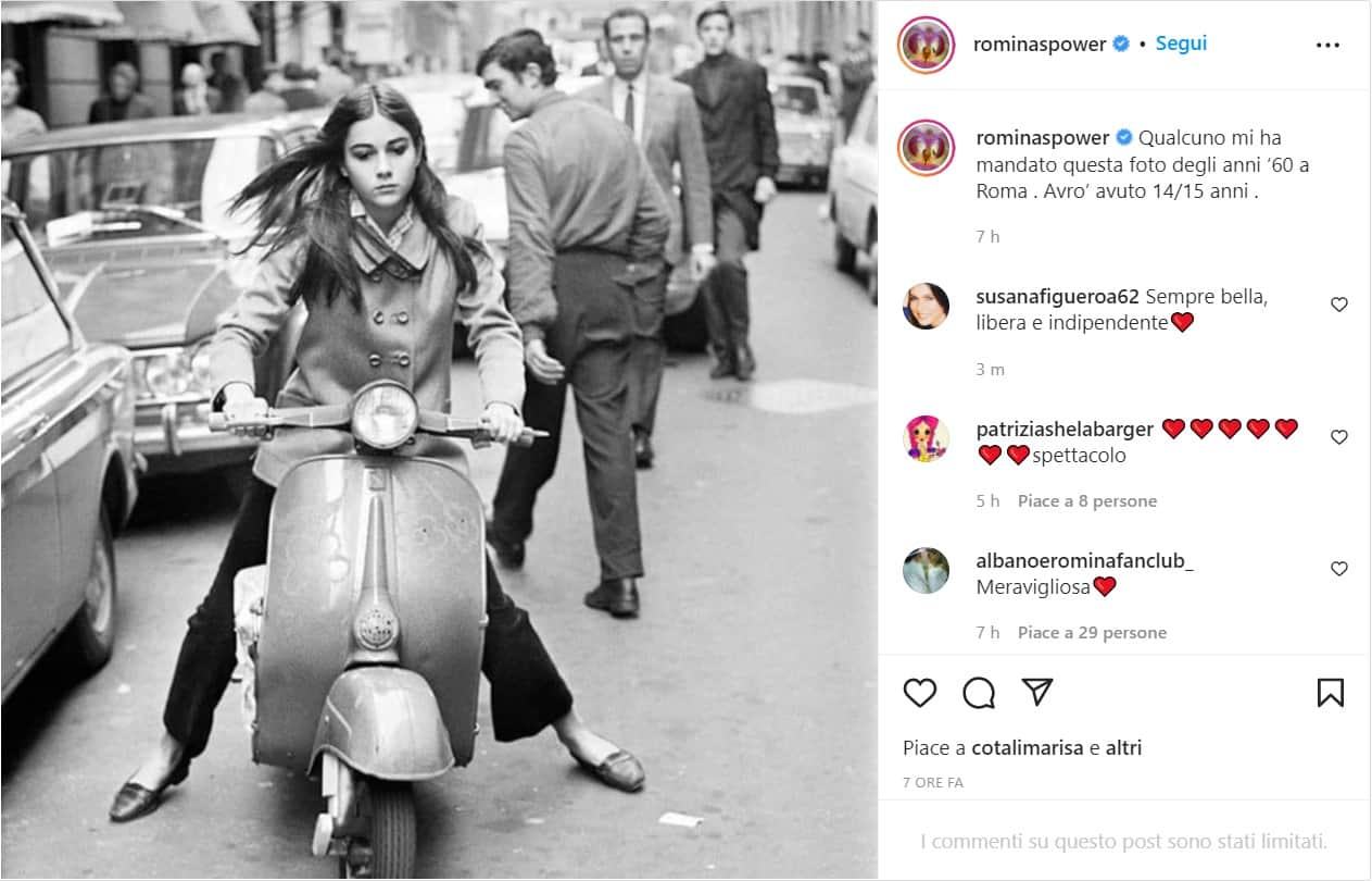 “Qualcuno mi ha mandato questa foto degli anni ‘60 a Roma. Avrò avuto 14/15 anni” scrive Romina Power nell’ultimo post pubblicato sul suo seguitissimo profilo Instagram. Il tutto accompagnato da una foto in bianco e nero di lei che, come una libellula, si libra i sella a un’iconica Vespa in mezzo al traffico (allora sicuramente meno infernale di oggi) di Roma.