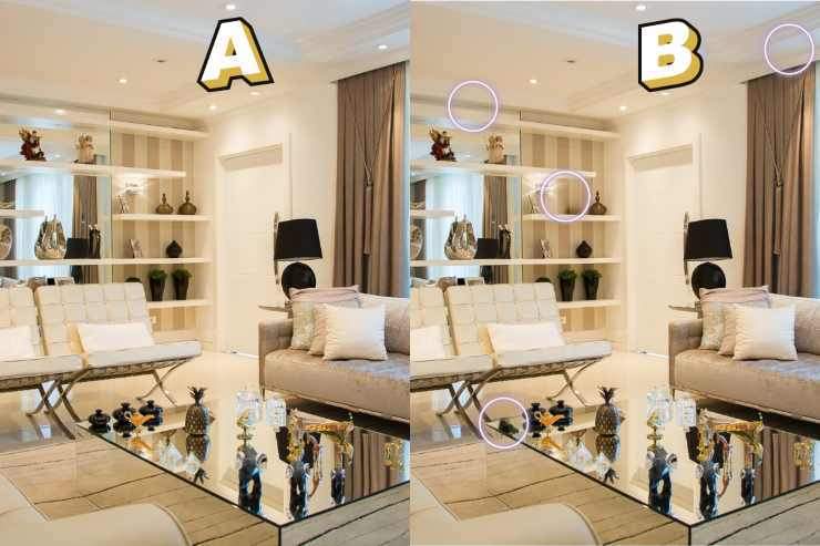 Nell’immagine puoi vedere le foto di due stanze, una accanto all’altra, che sembrano del tutto identiche. Ma non è proprio così… Ci sono ben quattro differenze! Non lasciarti ingannare: i test di questo genere provano a confondere la nostra mente – e la nostra vista – cercando di farle tralasciare i dettagli in immagini ricche di elementi.