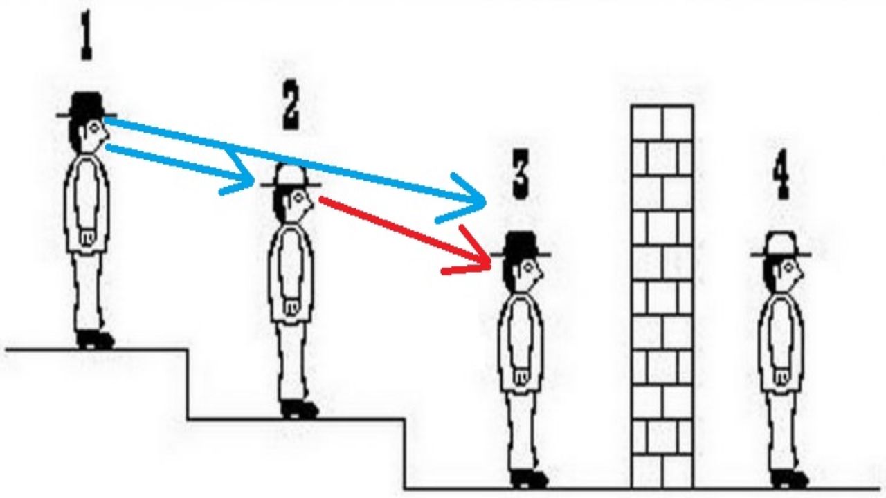 Appare immediatamente chiaro che il numero 4, quello all’estrema destra del disegno, non ha alcuna possibilità di indovinare il colore del cappello che ha in testa. Per lo meno ha solamente il 50% di possibilità di farlo. Essendoci infatti solo due colori, potrebbe tentare la sorte e indovinare per pura fortuna. Questa è esattamente la posizione di partenza di tutti, tuttavia, c’è uno di loro che ha maggiori chance di indovinare.