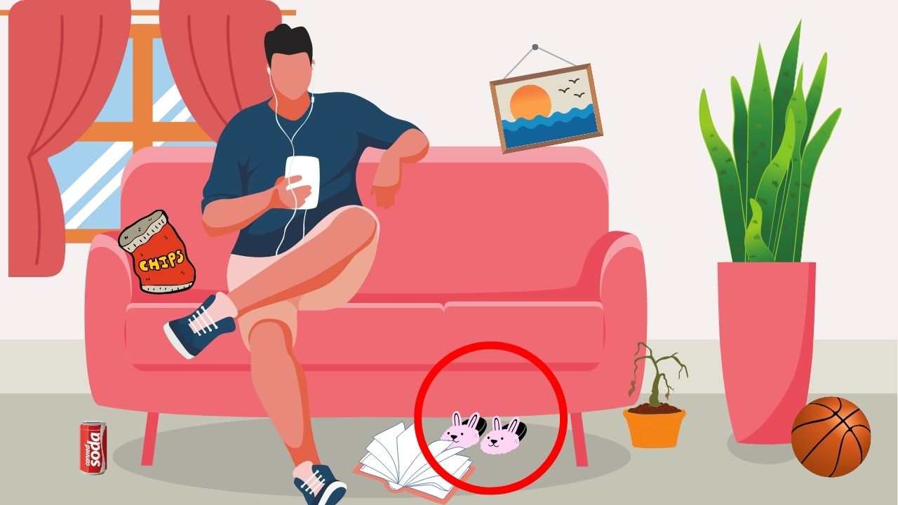 Eppure il disegno vi vuole trarre in inganno puntando proprio su questa opinione comune, perché il ragazzo fidanzato è proprio quello più disordinato. A darvi la soluzione è un dettaglio che potrebbe sfuggire a primo sguardo: sotto al divano ci sono le pantofole della sua ragazza. Come facciamo a dire che sono della fidanzata? Difficilmente un ragazzo metterebbe delle pantofole rosa a forma di coniglietto.