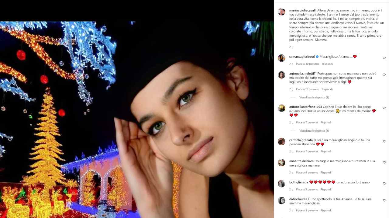 “Allora, Arianna, amore mio immenso, oggi è il tuo comple-mese celeste. 6 anni e 1 mese dal tuo trasferimento nella vera vita, come la chiami Tu. E mi sei sempre più vicina, ti sento sempre più dentro me. Andiamo verso il Natale, festa che un tempo adoravo e che ora è pregna di malinconia. Tante luci colorate intorno, per strada, nelle case… ma la tua luce, angelo meraviglioso, è l’unica che per me abbia senso. Ti amo prima-ora-poi e per sempre. Mamma”.