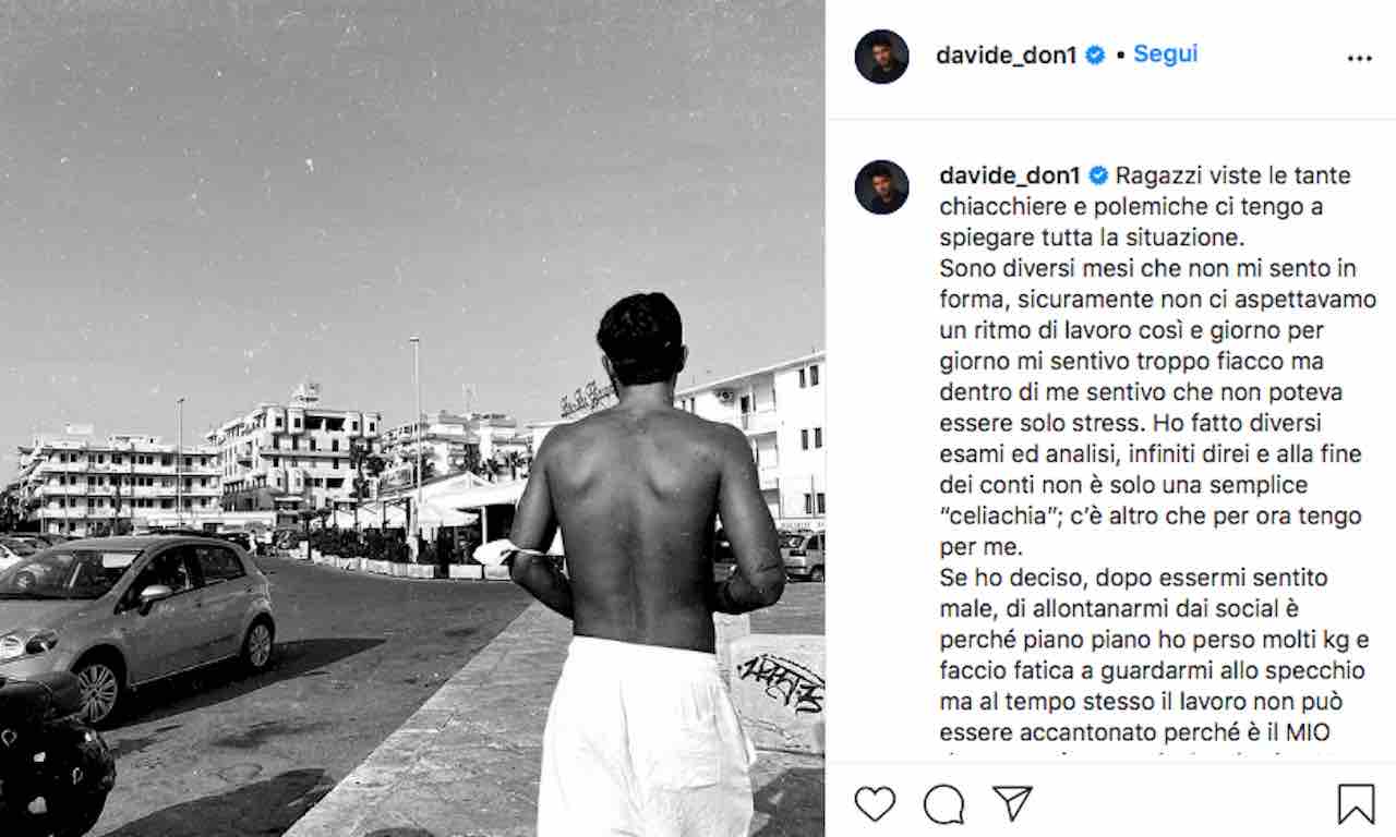 Il motivo per cui si è allontanato dai social è ancora più profondo: “Piano piano ho perso molti kg e faccio fatica a guardarmi allo specchio” ha scritto Davide. “Al tempo stesso il lavoro non può essere accantonato. Ho semplicemente bisogno di stare sereno e riprendermi. Grazie per tutti i messaggi”.