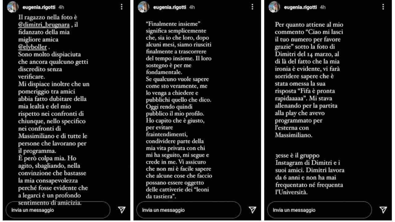 Visto che c’era anche chi aveva tirato in ballo un commento lasciato dalla stessa ex corteggiatrice sotto una foto di Dimitri del 14 marzo, Eugenia Rigotti ha voluto fugare ogni dubbio pure su quello. “Per quanto attiene al mio commento ‘Ciao mi lasci il tuo numero per favore grazie’ […], al di là del fatto che la mia ironia è evidente, vi farà sorridere sapere che è stata omessa la sua risposta ‘ Fifa è pronta rapidaaaaaaaaa’. Mi stava allenando per la partita alla play che avevo programmato per l’esterna con Massimiliano“.