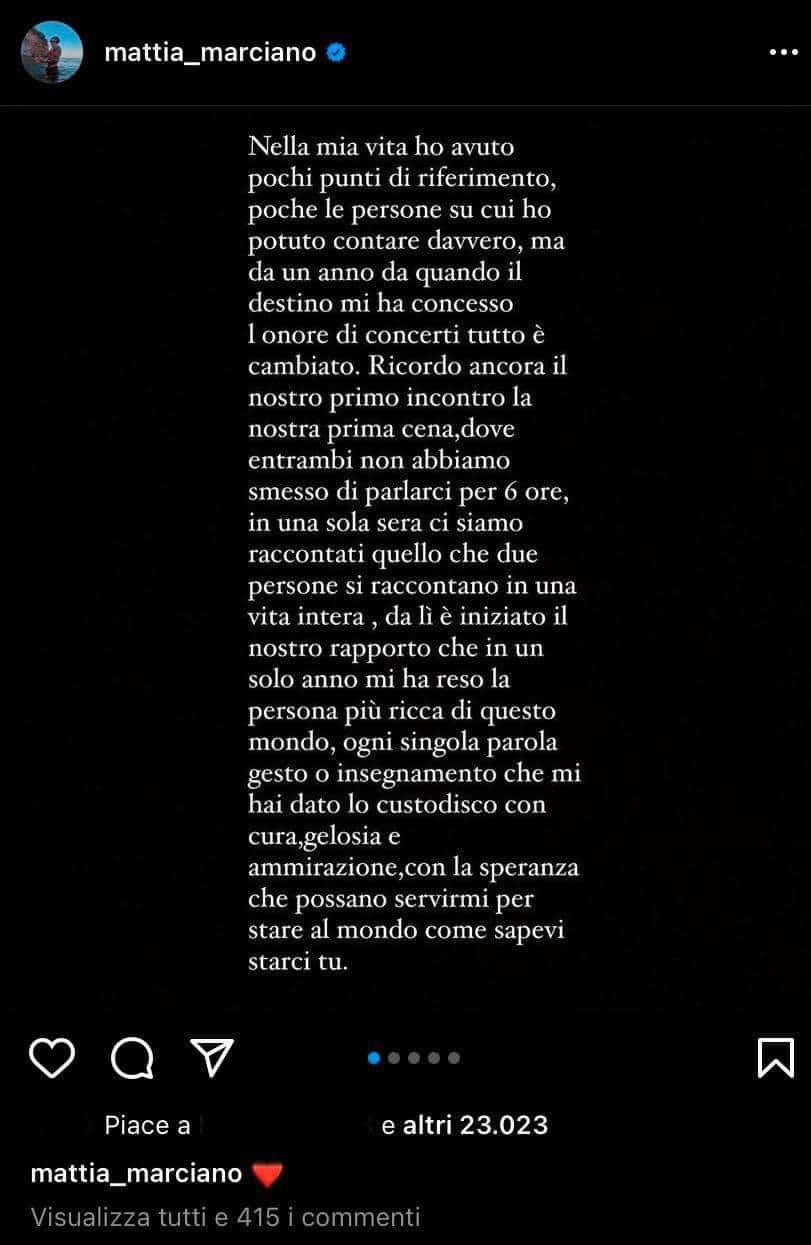 L’ex tronista di Uomini e Donne ha speso un po’ del suo tempo a ricordare il suocero sul suo profilo social, suscitando la commozione di tutti i suoi follower e amici, i quali non hanno indugiato a scrivere per lui delle dolci parole di conforto. Mattia ha raccontato su Instagram il primo incontro, avvenuto un anno fa, con il padre di Camilla, ammettendo quanto quest’ultimo gli abbia cambiato la vita in meglio. Tra il trentenne ed il suocero correva un rapporto speciale, che ha indubbiamente permesso a Marciano di crescere e di essere una persona migliore.